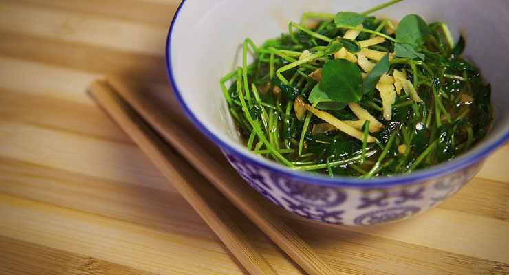 6. Remove from heat, and serve immediately. Top with freshly chopped ginger and fresh pea leaves. Enjoy!